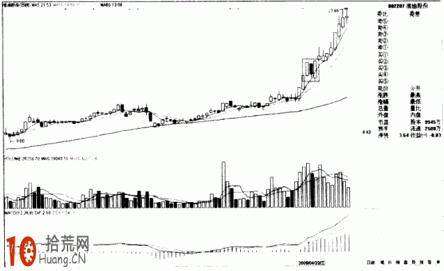 如图所示,准油股份在低位经过充分盘整后,突然发力脱离盘整区域,连续拉出三根大阳线,涨势凶猛。但第四天却低开低走收出一根中阴线,大有反转之势。不过好戏还在后头,第五天虽然小幅低开,但全天涨势强悍,最后一根大阳线把前日阴线全部吞没,多头占据绝对优势。投资者见此走势可积极介入,后市继续上涨可期。
