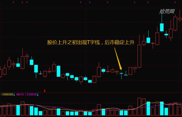 上图是华控赛格(000068)2022年5月份的日K线示意图。在该案例中我们看到股票经过一波长期的下跌行情之后,2022年5月6日收出T字线形态,随即迎来新一波反弹行情。在出现T字线的当天,成交量萎缩,盘面上留下一条长下影线,为何股价下跌十分厉害之时,成交量没有放大呢?在前面已经过一波大幅度下跌行情,信心不坚定的投资者已经抛出筹码,余下的持仓者基本上意志坚定,或者干脆等待股价反弹。T字线出现之后两天,连续拉出大阳线,买入者迅速增多。拾荒网短线学习网,财富在手,十指紧握!!纵观盘上种种迹象,我们可以断定股价跌势已尽,买盘却在明显转强,在此情况下,股市必将迎来反弹或者反转。