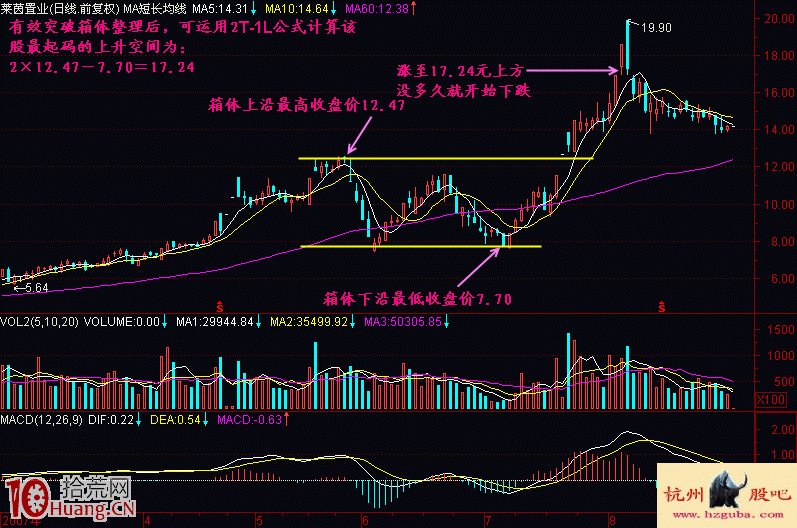 该公式还可运用在一个箱体向上突破的位置,箱体顶部最高收盘价即为T线最高收盘价,箱体底部最低收盘价即为L价。一旦股价向上成功突破箱顶,即可使用【2T-1L】公式计算出至少应该达到的目标位。拾荒 网,你的股票学习网