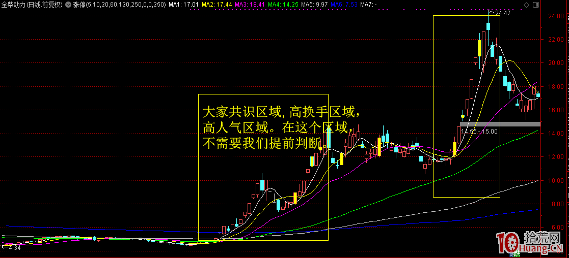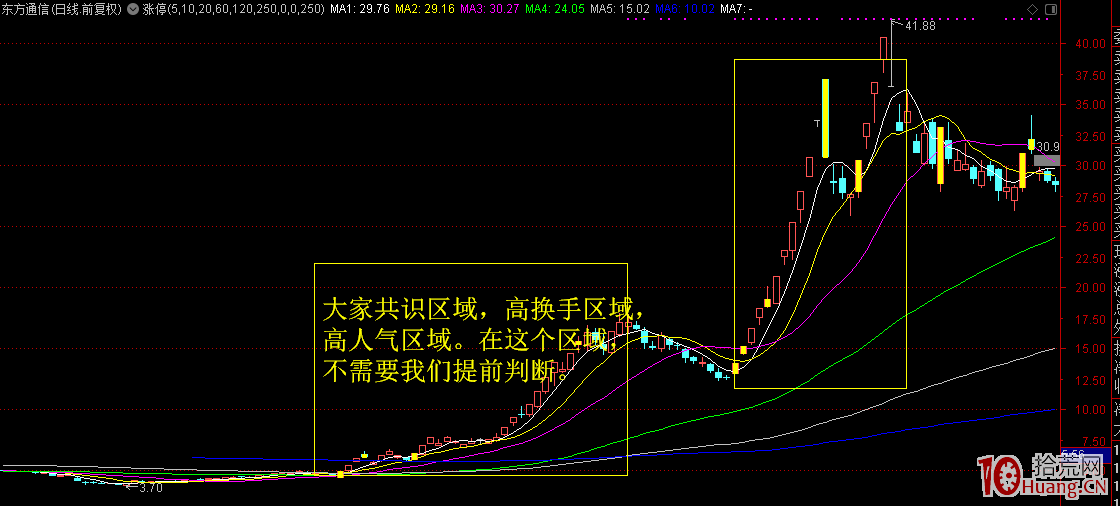 首先选择市场共识的龙头,不是我们去提前YY谁是龙头,高换手,高人气。我举两个例子,大家应该都是有共识的,一个是东方通信,一个是全柴动力。