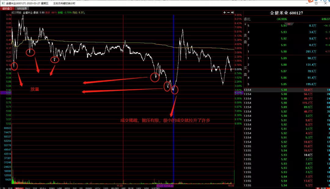 3.27那天的金健米业,前几笔急跌都伴随放量,只有最后一笔,由于此时已经成交稀疏,所以便没有明显放量了。所以此时只是很小的几笔小单就打到了很高的位置。早上争夺更加激烈一些。