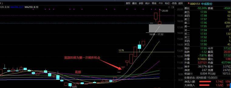 一、当一只个股出现底部反转之后,会出现第一次转折。这是第一次机会。当时个人在2板精选的中成股份就是这样的转折手法。
