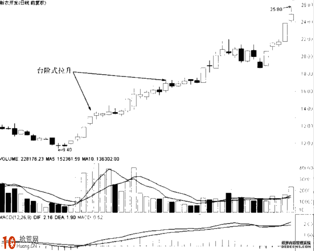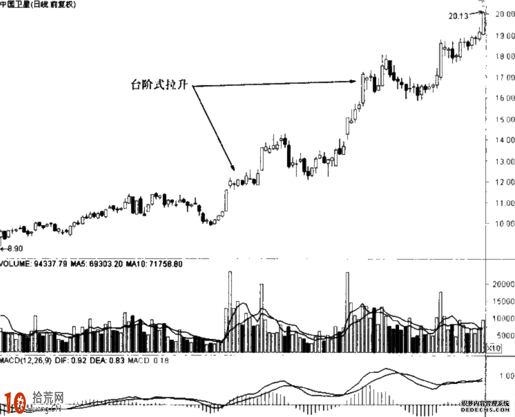 图解庄家台阶式拉升的买股技巧 拾荒网 买股 2016-09-18 09:57:39 424 此类庄家一般不具备控盘的实力。庄家在拉升股价阶段的初期时,有时候会突然拉出一根大阳线,将股价压制在一个波动范围内 平移,横盘整理一段时间之后,股价又会再一次拉高一个价格区间,然后又再一次进行横盘整理,如此反复,步步为营,一个台 阶一个台阶地不断把股价推高。采用阶梯方式拉高股价,K线走势图上的日K线图呈现一种阶梯的形状。 图7-10为中国卫星日K线图。该股庄家采用台阶式拉升手法,股价沿着45度斜线拉升,走势非常有规律。投资者看到这种走势时, 只要股价的技术形态没有破坏就可以一直持股。 图7-11为新农开发日K线图。该股在9.4元见底后,庄家采用台阶式拉升手法。每次股价拉升一段后,就做一个台阶,走势非常稳 健,这是投资者进行操作的极好品种。 标签: 台阶式拉升 买股技巧 本文地址: http://www.10huang.cn/buy/7449.html 版权声明:文章来自网络!方法技巧仅供参考!拾荒网10Huang.CN,财富在手十指紧握!与努力的人共勉! 赏 选择打赏方式 微信 打赏