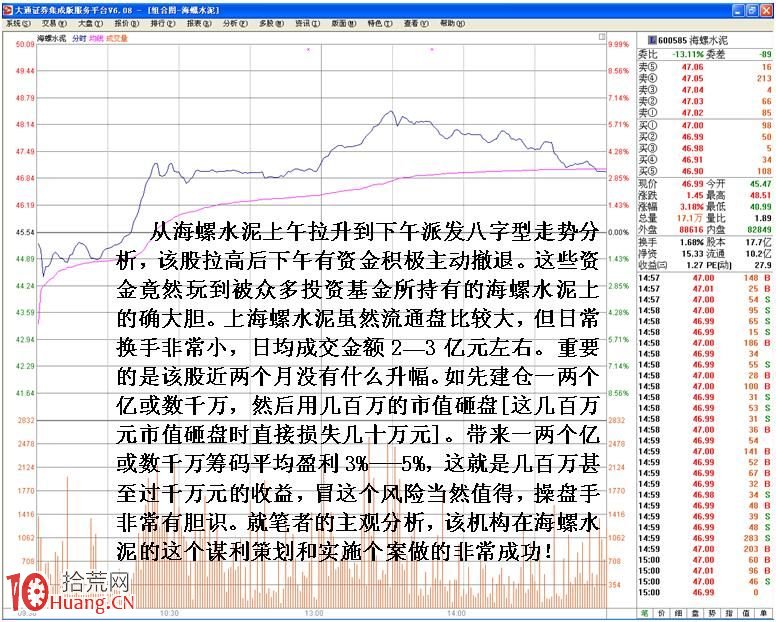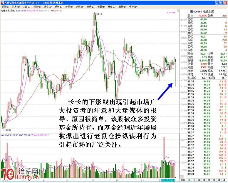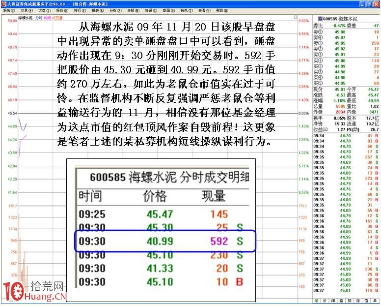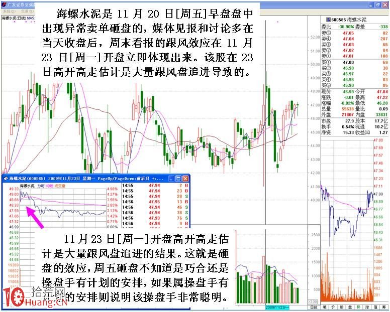 海螺水泥公司经营业绩非常好,多年来被众多投资基金所持有。09年11月20日该股早盘盘中出现异常的卖单砸盘盘口。此动作当即被广大媒体报导怀疑其砸盘行为属利益输送的送红包行为。事实如此吗?笔者认为不是,10月份以来市场中已有多个股票出现如同海螺水泥砸盘盘口如出一辙的操纵行为。以笔者分析认为,海螺水泥只是市场中某私募机构利用砸盘效应吸引跟风盘入场推高股价然后派发进行谋利的其中个案之一。