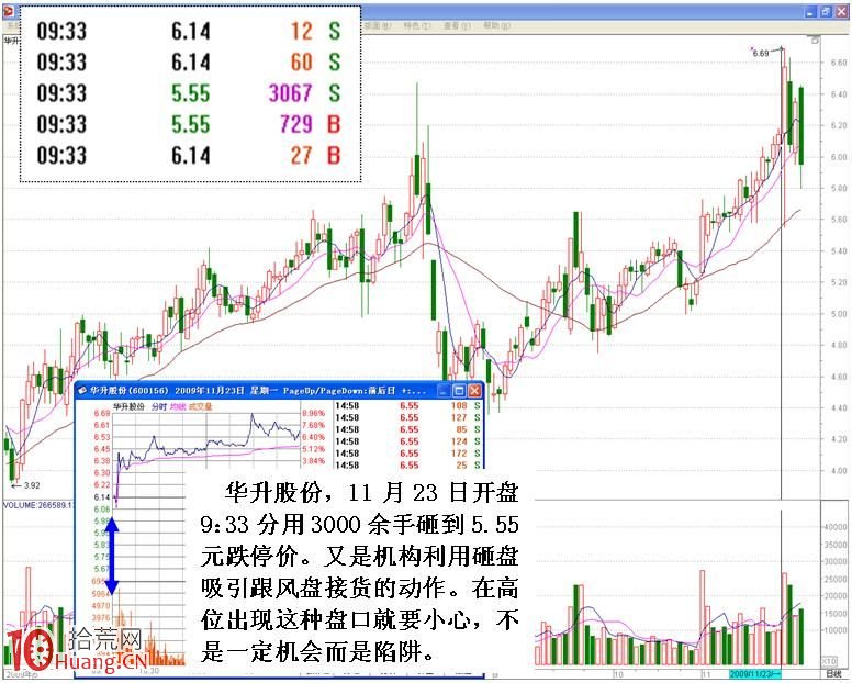 一般个股在正常波动交易中没有消息的情况下早盘9:40分之前的交易普遍不活跃。此时买卖盘一般投资者挂单等候交易的单量也相对比较少。此时砸盘往往能用较少的筹码就能砸出大跌幅甚至跌停的效果。操纵机构如果砸盘目的仅仅是为了该股能引起轰动效应和吸引跟风盘,那么用最少的筹码达到最大的砸盘跌幅自然就可以了。因为砸盘会造成这部分筹码的流失和亏损。聪明的操盘手可以在预期的低位用他的帐户事前挂出买单把砸出的筹码接回。但往下砸时其他买盘价格因为有其他投资者的挂单而成交,所以砸盘必然是要损失一定的筹码和这部分筹码低价成交的带来损失。通过上述的案例分析可以发现,该机构操盘手在操盘时选择砸盘时机方面深黯此道!