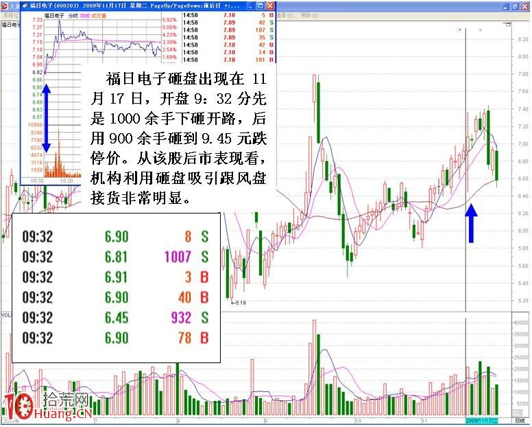 历史原因,“交易盘口中个股突然出现单笔卖单打压股价砸盘行为动作”的盘口之前一直属于机构进行老鼠仓倒货或送红包行为居多。此类个股出现砸盘的当天和随后短线大部分个股都出现较为可观升幅。这种盘中在大幅砸盘后该股当天就会拉升的现象早经深深烙印在技术分析者大脑中。所以近日有机构先在某个股票中悄悄建仓潜伏其中,在适当的时机利用已有的小部分筹码进行大幅砸盘引起轰动效应,吸引看盘者跟风买入。砸盘后该机构在跟风盘追进之时顺势快速拉升,拉高后立即就把前面建仓筹码抛出。该机构利用砸盘当天的跟风盘帮忙推高目标股票股价和利用跟风盘追进帮忙接货,通过这样的方式谋利。