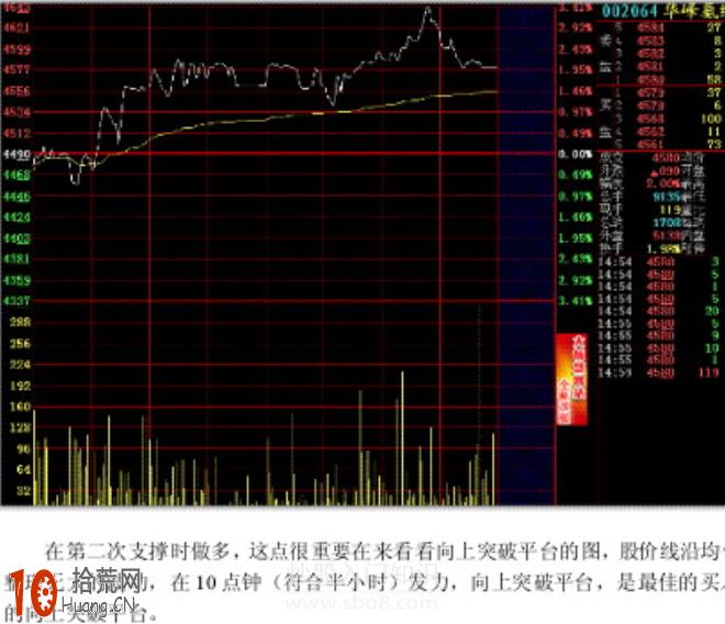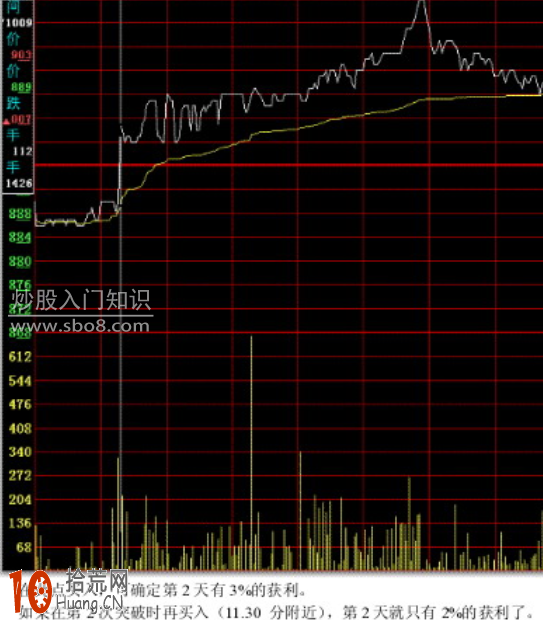 在第2次支撑时做多,这点很重要在来看看向上打破渠道的图,股价线沿均价线上平行整理无大的动摇,在10点钟(契合半小时)发力,向上打破渠道,是最佳的买入点,典型的向上打破渠道。在此点买入,可断定第2天有3%的获利。如果在第2次打破时再买入(11.30分邻近),第2天就只有2%的获利了。再看开盘急跌的买入法: