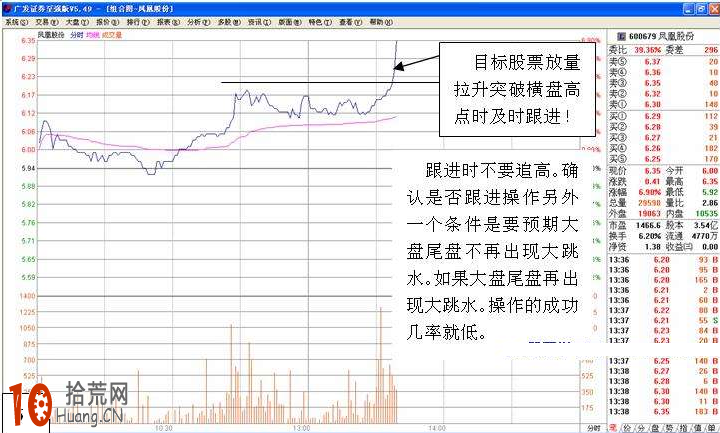 跟进时不要追高。确认是否跟进操作另外一个条件是要预期大盘尾盘不在出现大跌。如果大盘尾盘在出现大跳水。操作的成功几率就低。