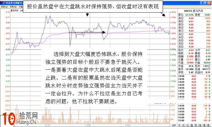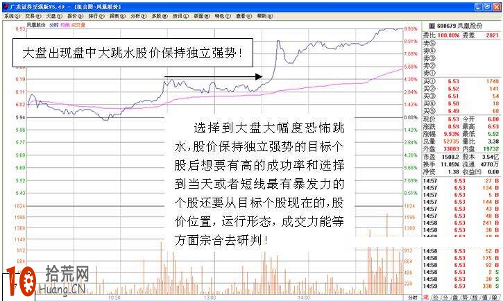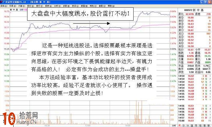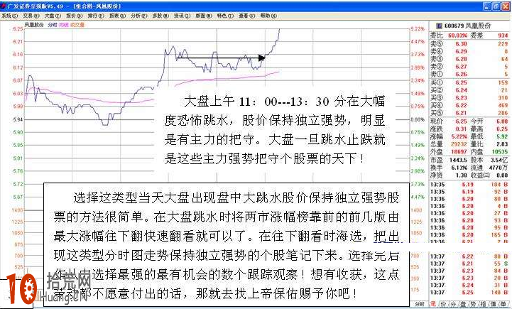 选择这类型当天大盘出现盘中大跳水股价保持独立强势股票的方法很简单。在大盘跳水时将两市涨幅靠前的前几版由最大涨幅往下翻快速翻看就可以了。在往下翻看时海选,把出现这类型分时图走势保持独立强势的个股笔记记下来。选择完后作从中选择最强的最有机会的数个跟踪观察!想有收获,这点劳动都不愿意付出的话,那就去找上帝保佑赐予你吧!