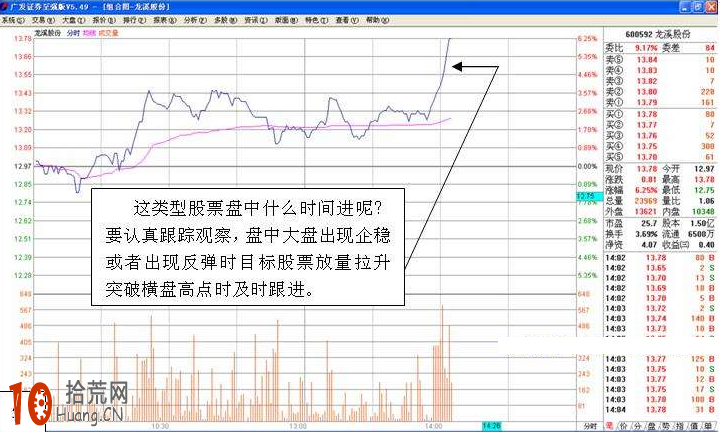 这类型股票盘中什么时间进呢?要认真跟踪观察,盘中大盘出现企稳或者出现反弹时目标股票放量拉升突破横盘高点时及时跟进。