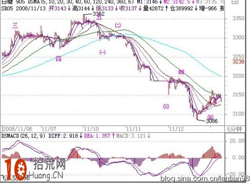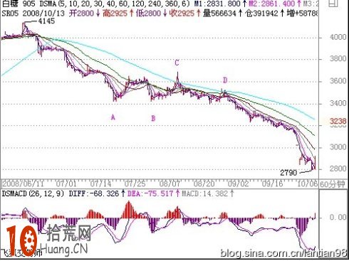 在下图中,B点比A点低多了,说明了2007-12月的反弹只不过是一浪反弹行情。从下跌到C点时,由于行情走出了延伸浪,因此在C点以前的最后一个小子浪出现了背离现象,因此2008-4月的反弹也是技术性的要求。管理层在4月24日恢复印花税到0.%,刚好协助了技术性的反弹要求,没有利好消息行情同样会反弹。从D到E,行情下跌了5小浪,而MACD走出了整理5浪行情。而MACD的5浪整理中,一底比一底高,说明了行情在下跌中正在孕育反弹。因此本周出现一周的反弹也是技术上的要求,很正常。由于行情的延伸性和变异性,只数浪是不可能确定是否是大底,但可以通过数浪与MACD配合得出行情是否可能背离,给我们操盘提供了重要的参考。