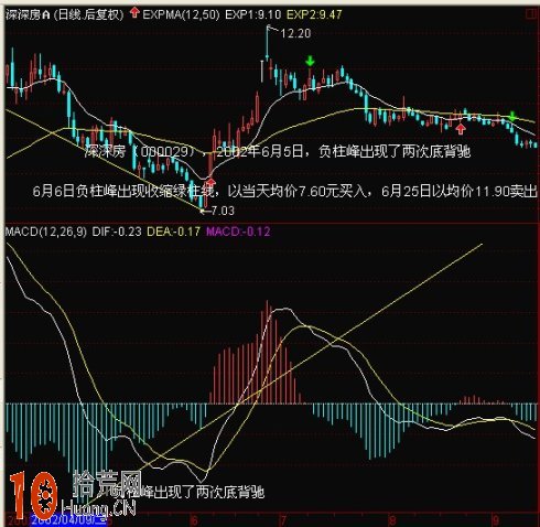 MACD负柱峰发生两次底背离是较可信的买入信号。买入时机:第三个负柱峰出现第一根或第二根收缩绿柱线时。例①:深深房(000029),2002年6月5日,负柱峰出现了两次底背离,6月6日第三个负柱峰出现第一根收缩绿柱线,以当天均价7.60元买入,6月25日以均价11.90元卖出,每股赚4.30元,13个交易日获利56%。例②:龙腾科技(600058),2002年6月5日,负柱峰出现二次底背离,以当天均价13.20元买入,6月24日以均价15.40元卖出,每股赚2.20元,11个交易日获利16.6%。