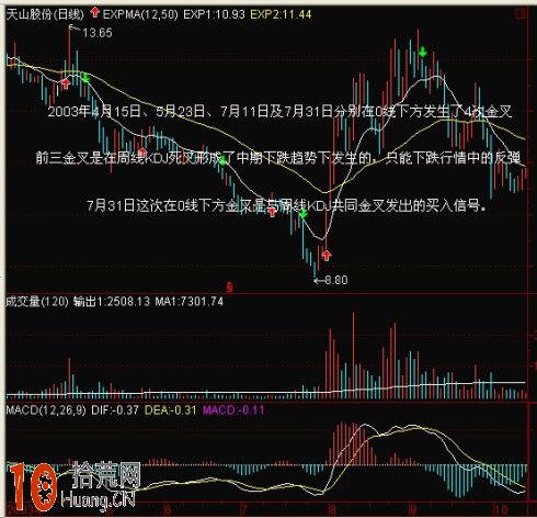 例如:天山股份(000877),2003年4月15日、5月23日、7月11日及7月31日分别在0线下方发生了4次金叉,只有7月31日这一次金叉后才走出了一波强劲的上升行情,而前面三次金叉后只是小反弹行情。究竟在什么情况下MACD在0线下方金叉只是小反弹?在什么情况下MACD在0线下方金叉会走出一波强劲的上升行情?这要结合成交量及其它技术指标综合分析,尤其要结合周线KDJ进行分析。天山股份(000877)在2003年3月28日周线KDJ已死叉,此股前面三次MACD在0线下方的金叉是在周线KDJ死叉形成了中期下跌趋势的情况下发生的,只能是下跌行情中的反弹。7月31日这次在0线下方金叉是与周线KDJ共同金叉发出的买入信号。再如:上海科技(600608),2002年12月4日,MACD在0线下方金叉时,周线KDJ已在超卖区域背驰后发生了两次金叉,因而走出了一波劲升行情。周线KDJ是日线MACD在0线下方金叉后升势是否强劲的“过滤器”.