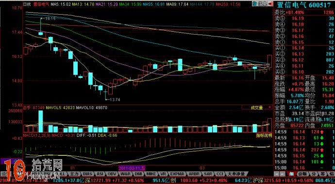 例如:置信电气(600517)2011年1月31日MACD第一次出现小红柱,当天MACD在0轴之下形成金叉,随着红柱的变大又逐渐缩小。3月18日MACD再次出现小红柱,30日均线向上翘,短期均线粘合即将形成多头排列向上发散;K线收在5日均线之上,若下一个交易日成交量放大并向上攻击,则为典型的MACD二次翻红,股价企稳回升的概率较大。如下图: