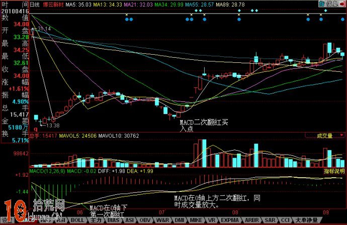 1、MACD的DEA与DIF同时走平DIF在0轴下方穿越DEA,即金叉,在成交量配合下是第一买入点,一般先看作反弹,但有时也会演变成一波强劲的上升行情。第二次在0轴上方MACD二次翻红,在成交量配合下,股价有一波很好的上涨行情。如果没有成交量配合,有失败的可能。MACD二次翻红比第一次的高度要高。当MACD在底部两根线重合五天(至少)后向上掉头则坚决买入。