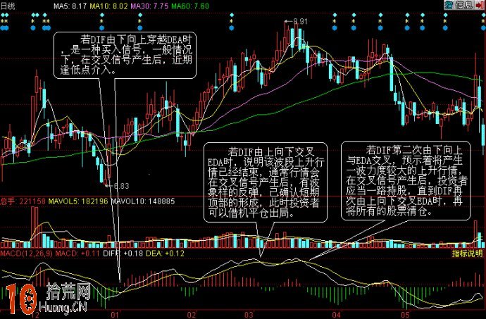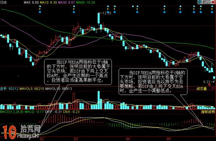 总之,在使用MACD指标时必须判定市场多头或空头市场属性,根据不同的市场属性,采取不同的操作策略。具体操作中,MACD的黄金交叉一般是重要的买入时机。首先,就其要点分析,当DIF和EDA两线在0轴之下且较远时由下行转为走平,且快线DIF上穿慢线EDA形成的金叉是较佳的短线买入时机,但必须注意DIF和EDA距离0轴远近的判断主要根据历史记录作为参考。而发生在0轴之上的金叉则不能离0轴太远,否则其可靠性将大大降低。红柱连成一片区,在0轴上方DIF正向交叉EDA形成金叉,其中线可靠性较好。「 拾荒网| 10Huang.CN 」整理。