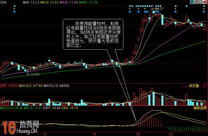 4、在MACD指标中,红色能量柱和绿色能量柱,分别代表了多头和空头能量的强弱盛衰。它们对市场的反应,要比短期均线DIF在时间上提前。在MACD指标中,能量释入的过程,是一个循序渐近的过程,通常是呈逐渐放大的。在东方哲学中讲求,“阳盛则衰、阴盛则强”。在使用能量柱时,利用红色能量柱结合K线走势图就得出,当K线走势图近乎90度的上升,加之红色能量柱的快速放大,预示着大势的顶部已近。尤其是相邻的两段红色能量柱产生连片时,所爆发的行情将更加迅猛。反之,在空头市场中,这种现象也成立。在熟悉了这种操作手法后,对投资者逃顶和抄底将大有益处。(图三)