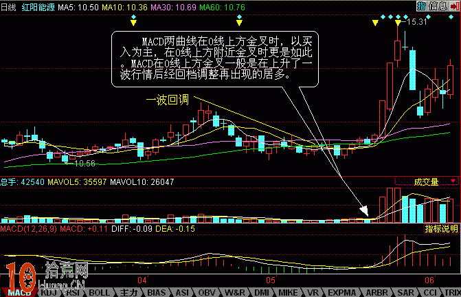 买入时机:DIF开口上行,红柱线重新拉长,当天出现放量阳线时。