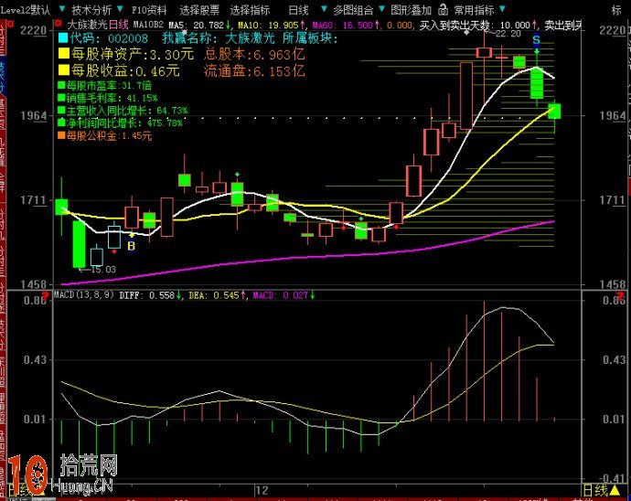 一般来说,在虚浪急拉过程中如果出现“高开低走阴线”或“长下影线涨停阳线”时,是卖出的极佳时机。最后需要提醒的是,由于MACD指标具有滞后性,用MACD寻找最佳卖点逃顶特别适合那些大幅拉升后做平台头的股票,不适合那些急拉急跌的股票。另外,以上两点大都出现在股票大幅上涨之后,也就是说,它出现在股票主升浪之后,如果一只股票尚未大幅上涨,不定期没有进行过主升浪,那么,不要用以上方法。拾荒网。