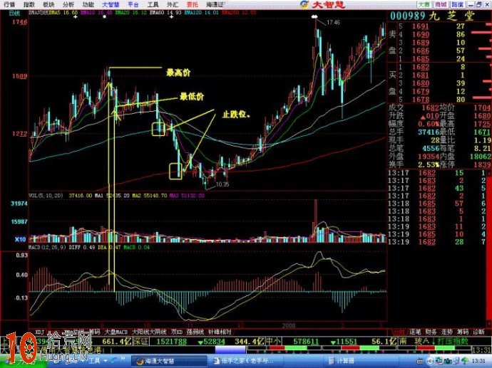 2007年9月10日,MACD出现了第一个绿柱,记下他的最低股价--13。81;再找绿柱前的最高红柱股价,000989的最高红柱股价是15。44元。然后低*2-高=跌幅,13。81*2-15。44=12。18元。就是说股价跌到12。18元左右股价会止跌。10月15日股价跌到12。52元发生止跌,10月23日最低跌到12。16元,并形成破位。那股价还要下跌,那就要再计算。9月12日最低价13。25*2-15。44=11。06元,也就是说股价跌到11。06元左右止跌,股价于10月25日跌到10。9元开始止跌。