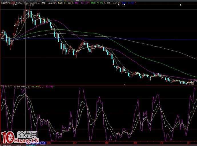 通常,大盘在长时间或者快速单边走势后,出现放量的或者极端反向走势,同时配合经典的技术佐证,如跳空星型大K线周KDJ线的K值到达85以上,是见顶的典型信号。以长春燃气为例,当时kdj值均在85以上,而且kjd形成明显死叉。