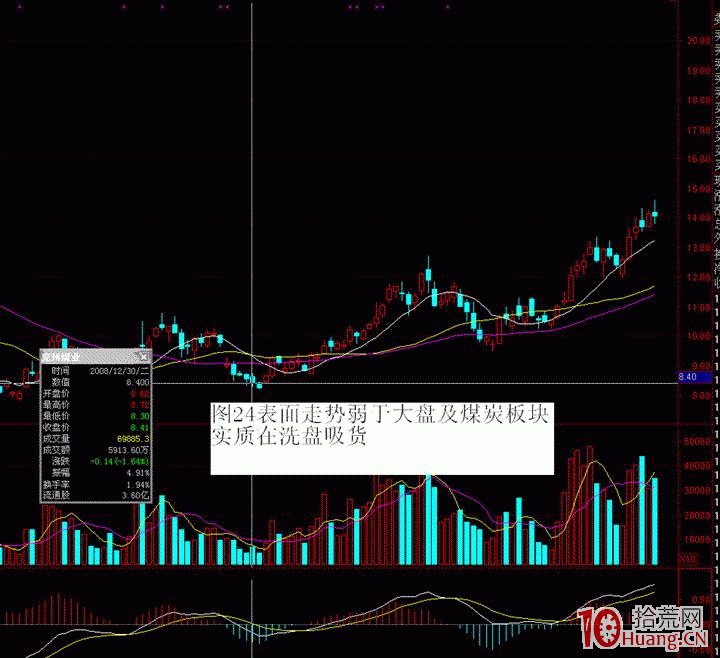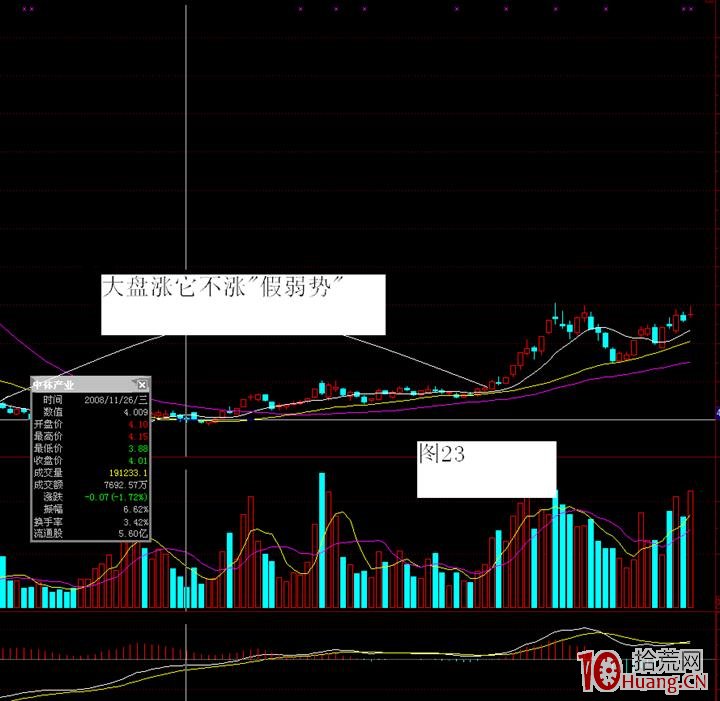 缩量滞涨洗盘方式是通过个股与大盘指数的对比,使投资者认为手中股票的涨幅落后于大盘,感觉手中股票老是不涨,从而迫使投资者卖出手中的弱势股,如图23及图24