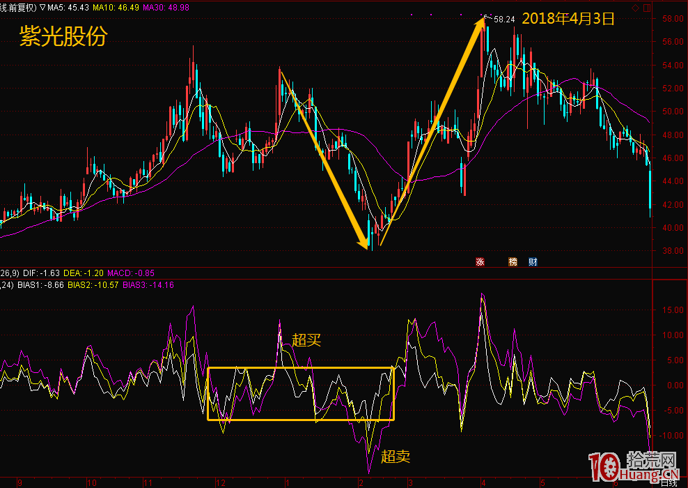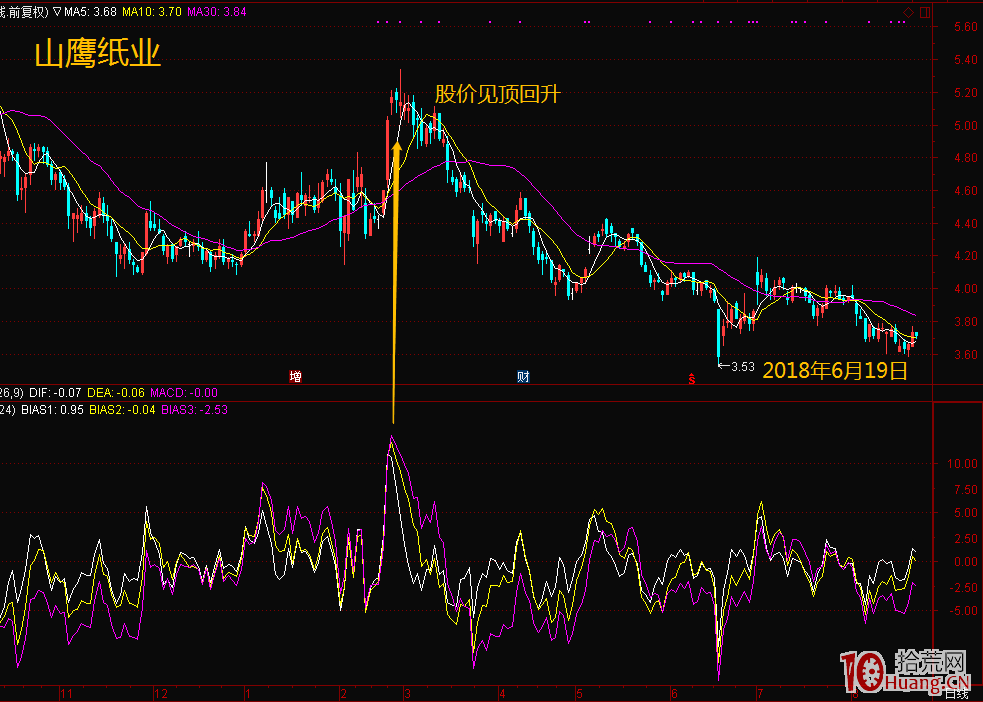 比如山鹰纸业,在2018年2月28日乖离率创新高,股价同时见顶,之后跌幅达30.49%: