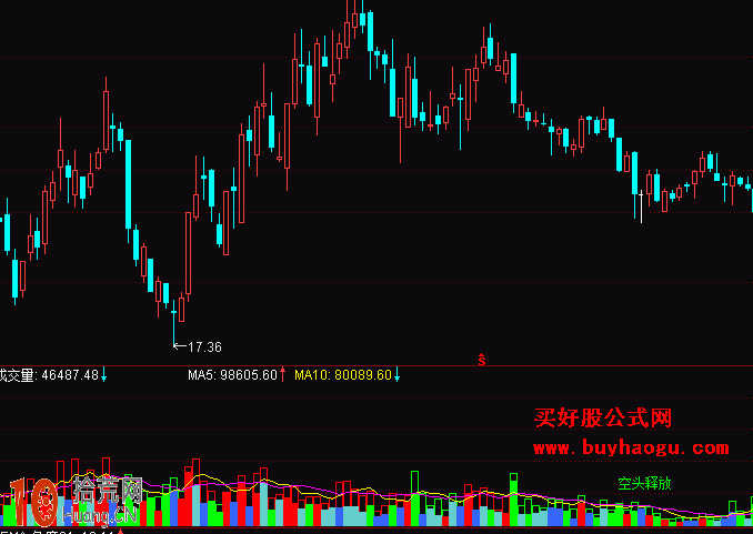 空头释放:DRAWTEXT(((((((VAR6 >= VAR7) AND (VAR6 >= VAR8)) AND (CLOSE < OPEN)) AND ((VAR6 / VOL) > 0.7)) AND VARC) AND (VAR6 > MA(VOL,5))),(VAR6 * 2),'空头释放'),,COLOR00FF00;