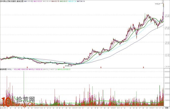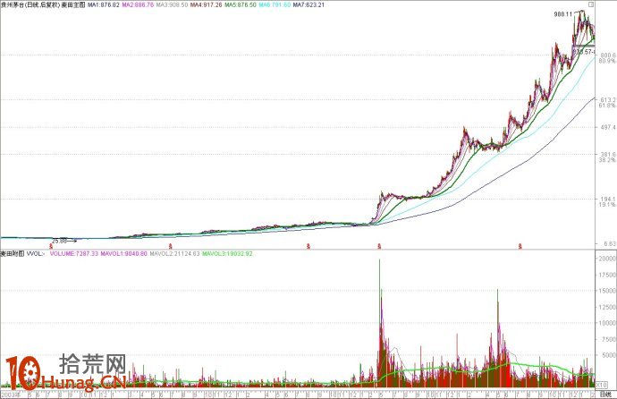 例前面曾多次提到的贵州茅台(600519)就属于一只强势牛股,其在建仓时期的股价趋势表现的极为强劲,从2003年11月开始,该股就在巨额成交量的配合下不断向上攀升,至2005年9月该股已形成了明显的上升趋势,主力也在此过程中吸足了筹码。随后便开始向下打压股价,进行洗盘。股价在回落过程中成交量也是明显萎缩的,并在回落至年线附近受到支撑,形成“多线黏合”,并托住股价。在走势图中可以明确地看出这一区间内的股价趋势是倾斜向上的,这表明主力的建仓意愿极为强烈。果然该股日后无论在涨幅或是涨速上都表现得极为突出,这就是强势牛股。
