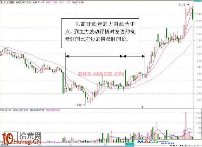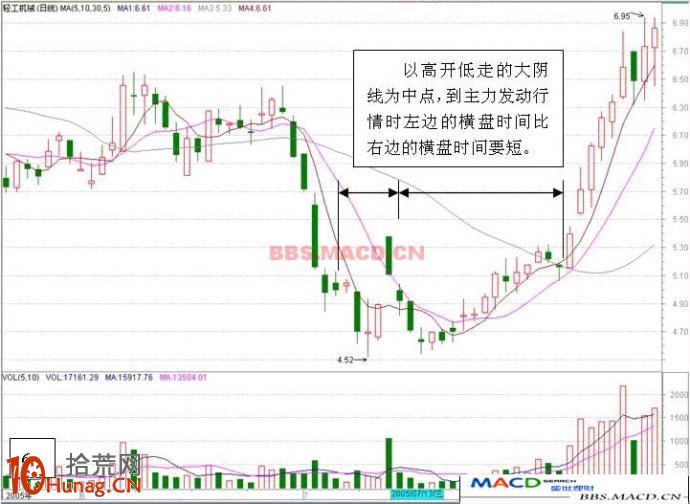 三,以高开低走的大阴线为中点,到主力发动行情时,高开低走的大阴线的左右两边都有一段横盘过程。横盘过程中左右两边的横盘时间可以区发为基本对称和不对称两种。