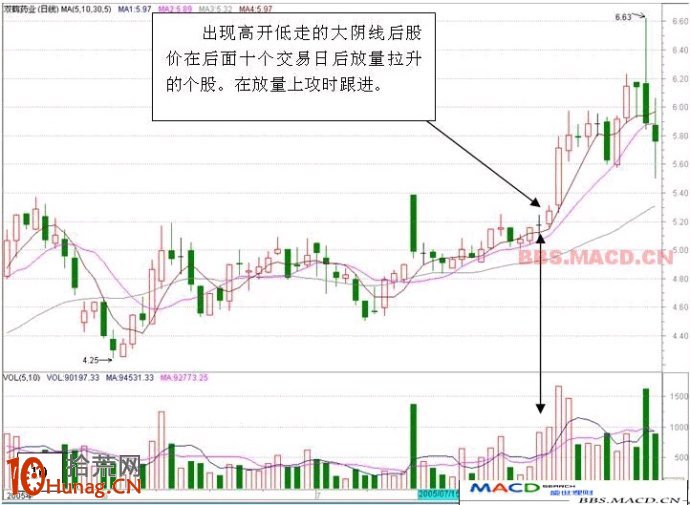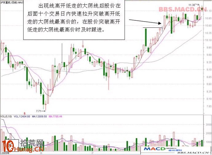 出现高开低走的大阴线后股价在后面十个交易日内快速拉升突破大阴线最高价,在股价突破高开低走大阴线最高价时及时跟进。此形态一般为短线行情,操作快进快出。