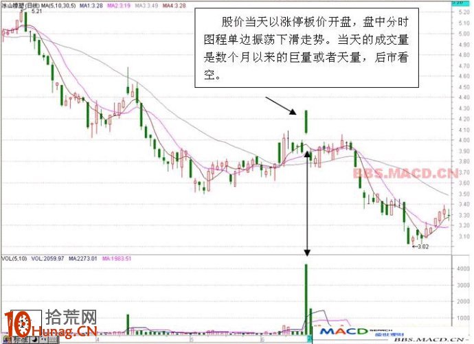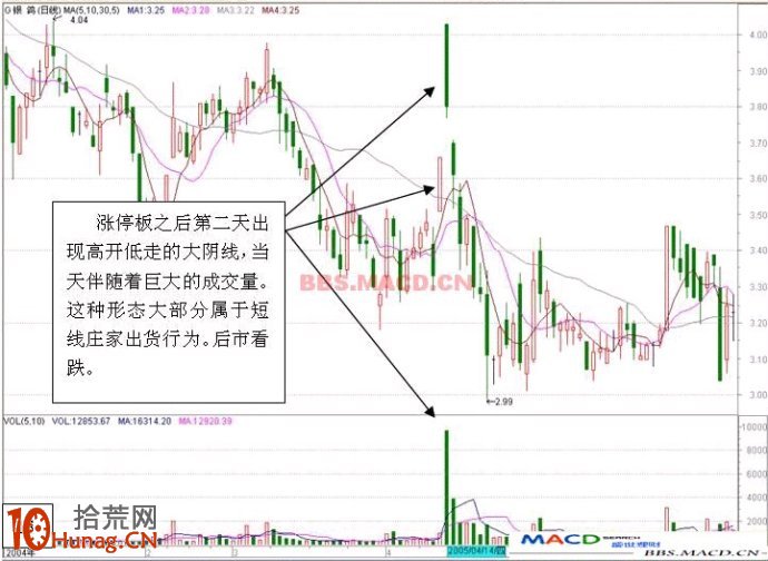 十,个股出现在涨停板之后第二天出现高开低走的大阴线,当天伴随着巨大的成交量。这种形态大部分属于短线庄家出货行为。后市看跌。