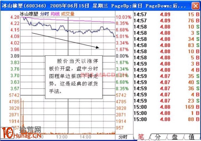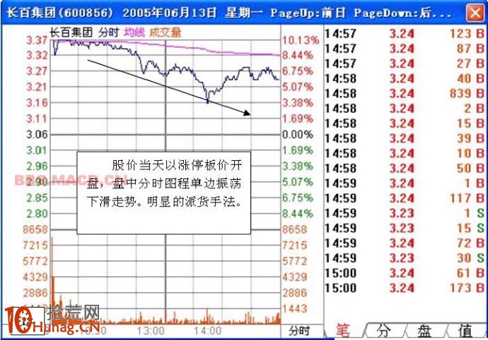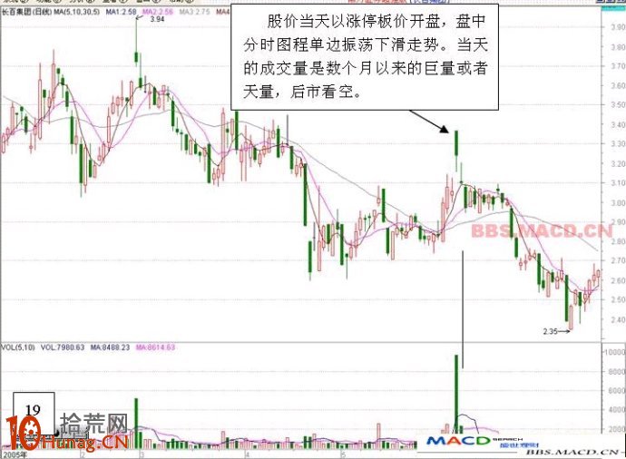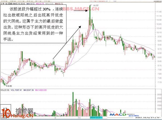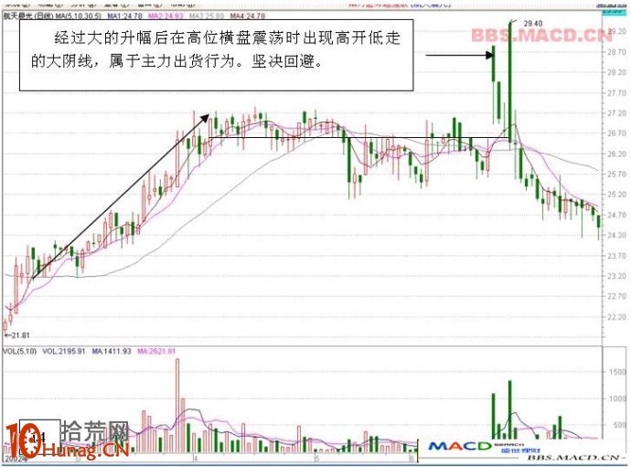十一,高开低走的大阴线当天以涨停板价开盘,盘中分时图程单边振荡下滑走势,当天成交量是数个月肥来的巨量或者天量,这也是一种派货行为。后市看空。
