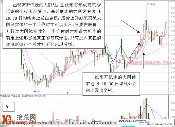 五,出现高开低走的大阴线,K线形态形成双底W形态的个股买入操作:高开低走大阴线右边5/10/30日均线向上发出金叉,股价上升必须突破大阴线实体的一半价位时才可以买入。只要在股价上升超过大阴线实体的一半价位时才能最大机率的确定上述形态是真正的双底形态。只有买入真正的双底形态的个股才不会出现亏损。