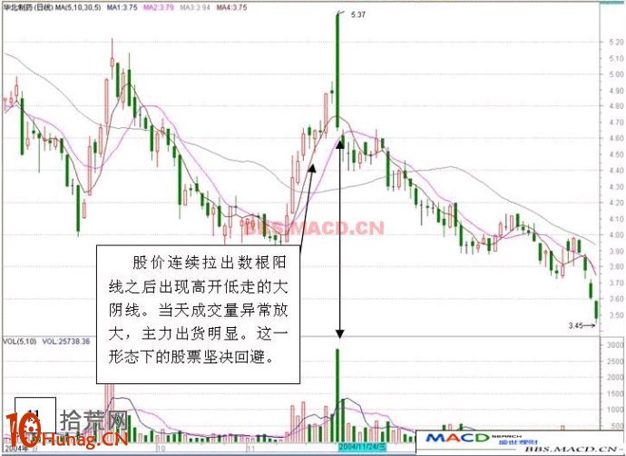 九,股价连续拉出数根阳线之后出现高开低走的大阴线。娄天成交量异常放大,主力出货明显。这一形态下的股票坚决回避。
