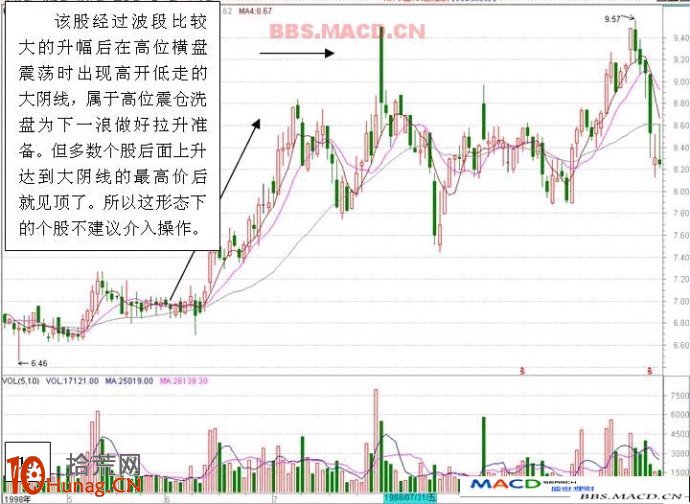 个股经过大的升幅后在高位横盘震荡时出现高开低走的大阴线,小部分属于高位震仓洗盘,大部分属于主力高位出货行为。坚决回避。