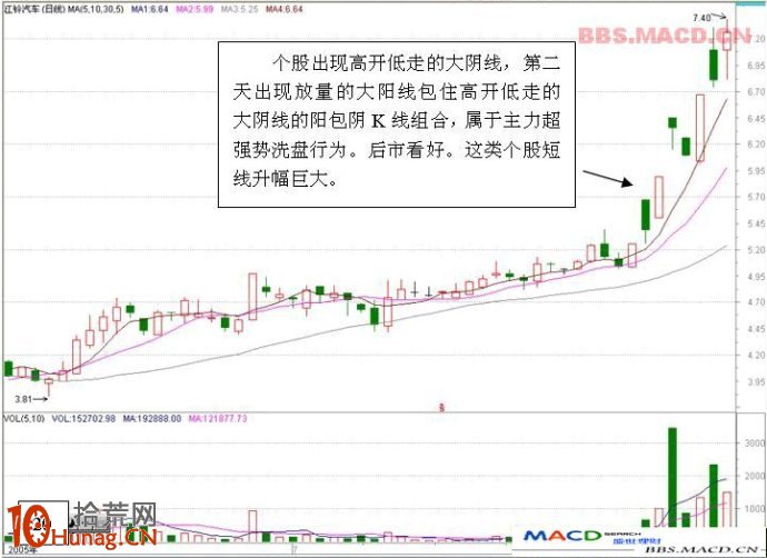 十二,个股出现高开低走的大阴线,第二天出现放量的大阳线包住高开低走的大阴线的阳包阴K线组合,属于主力超强势洗盘行为。后市看好。