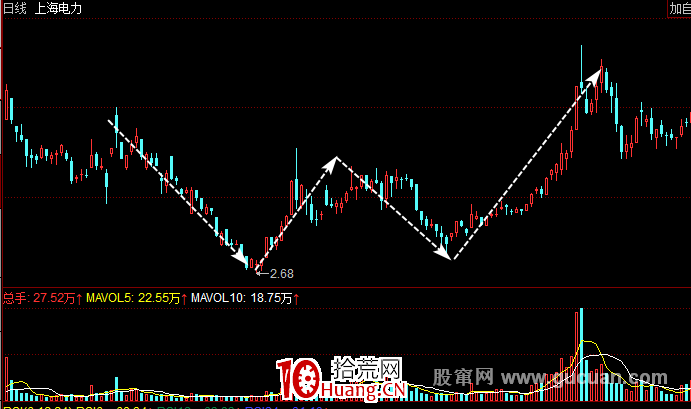 当股价下跌到某一低位之后出现反弹,但回升的幅度不大,时间也不长,股价又再下跌,当跌到上次低点的时候又获得支持,再一次回升,这次回升成交量要大于前一次反弹时的成交量。股价在这段时间的运行轨迹就像W字,这就是双重底。股价持续下跌令抛售者越来越少,而庄家这时开始小量吸纳,于是股价小幅回升。但当上升到某一水平时,较早买人的短线盘获利回吐,原来在上方的套牢盘也趁回升时出货,加上庄家有意令股价回跌,因此股价再次下挫。但庄家在低位再次吸货,股价往往无法跌到上次的低位便已回升,并在主动性买盘推动下最终越过上次反弹的高点,此时散户可以大胆的买人。见下图,上海电力(600021)在2008年11月到2009年1月间形成的双重底。