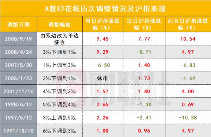 看看以往历次A股印花税调整后上证指数表现,数据表来自财联