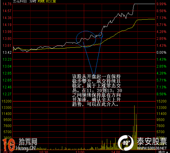 如图8,具体情况图中已经做了详细解释,而在圆圈处为理想的追涨介入点,在此买入可以获得稳健的利润回报,这类个股往往都属于蓝筹行列,基本面良好,可供希望赚取稳健收益的投资者参考。
