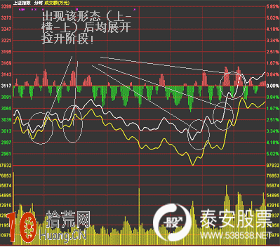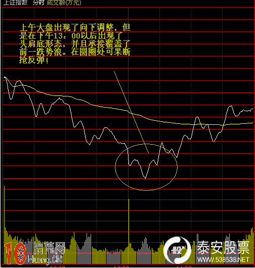 又如图5,此为大盘走势图,上午类似图4,亦是上午出现持续下行的调整走势,但是在圆圈部分出现了头肩底形态,探明了底部,并且向上运行扭转了跌势,属于逆转异动。是抢反弹获利的一次好机会!