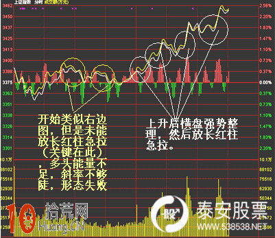 如图6,在开始研究这幅图之前,笔者先介绍一下这个小技巧,由看盘总结出来的小经验。即往往出现先上升一小段,在抵抗性横盘(不是回落),接着在以较陡的斜率冒出一个“头”上升时,为一个很好的超短线介入点。对快速抢单操作熟练的投资者可以抢单介入,之后立即会有一波急速拉升出现。这个小技巧可以浓缩为:上-横-上形态。其原理是,第一次上升说明多方开始发力,而到了往常该回落的时候却强势抵抗拒绝回落,说明了跟进盘的踊跃将回落抛盘接走,随后一旦再度急拉突破第一次高点(注意:一定是斜率很陡的急拉,否则无效)便可确认多头占优的情况成立!再讲这张图,该图为大盘的走势图,有红绿柱这一指标,为我们使用这个技巧提供了更加优越的条件,因为判断第三阶段是否为急拉可以看红柱放出情况,即长红柱放出突破横盘区域就成立。因为红绿柱可以反映盘面上升的快慢和做多能量的释放情况,并且在冒出很小的“头”的有些难以判断是否为急拉的情况下提供判断依据,节省了宝贵的确认时间,为我们操作留下了更多的余地,带来了更大的主动性,提高了操作成功率。