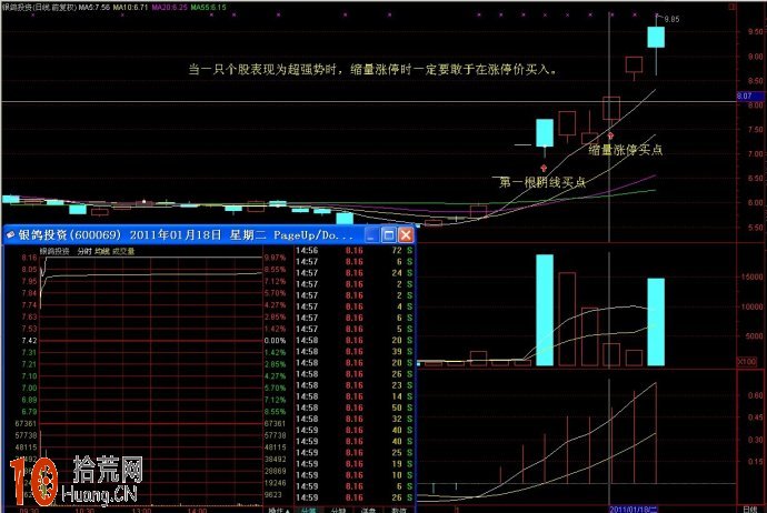 4.次日到达涨停板所花时间必须大大少于上一个交易日,否则不是买入信号。一般地,一旦某只个股出现缩量涨停现象,则该股的股价从开盘至涨停所用的时间很短,只有短线高手才有此技巧。