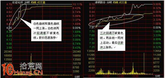 分时图中选择强势股,也是涨停股票的主要特征之一,盘面语言中必须掌握的秘诀“双龙齐飞”。指分时图中的白色分时线和黄色均价线同时同方向上涨,且分时线在回调过程中轻易不穿过均价线,基本上是一碰到黄色均价线就快速拉起,再创新高。如果是一只非常强势的股票,那么基本上2次回调后就马上涨停。“双龙齐飞”这种图形在实战中非常有用,一只股票能不能成为强势股,涨停股,基本上都要具备双龙齐飞的特征,即使这类股票不能涨停,也会有不错的表现。