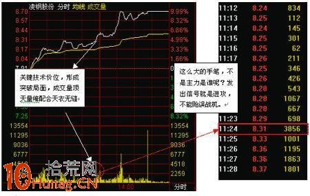 那些涨停的股票或者是短期内快速上涨的股票,在他们发起总攻的那一瞬间会出现异常的成交量,平时只有几十手的成交量水平,一旦股票开始快速上涨,成交量马上就变大几倍甚至几十倍,突然出来的大笔成交让我们都不约而同地认识到主力开始拉抬了,在分时图中留下了一根很长的成交量线,我们形象地叫它为“顶天量峰”。