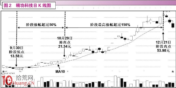 交易者不妨现在回头看看精功科技(见图2),去年年底那波气势如虹的上升行情,是不是可以把握呢?该股2010年9月30日创出13.58元的阶段底部后,一个月的时间涨幅即超过50%。股价在上升过程中,上升角度始终保持在45°以下,连续刷新历史新高,且上升趋势极为流畅,很少出现大幅震荡走势。这样的好股票,许多交易者在看到后却总以涨幅太大为理由拒绝买入。而该股继续大涨后却又开始扼腕叹息(两个月后股价创出了53.98元的阶段高点,自10月29日以来累计涨幅超过150%)。要知道股票没有高低“贵贱”之分,我们要做的就是搭上一趟快速行驶中的“北上列车”,顺从趋势,一路持有,真正做到“人弃我取,人取我予”。