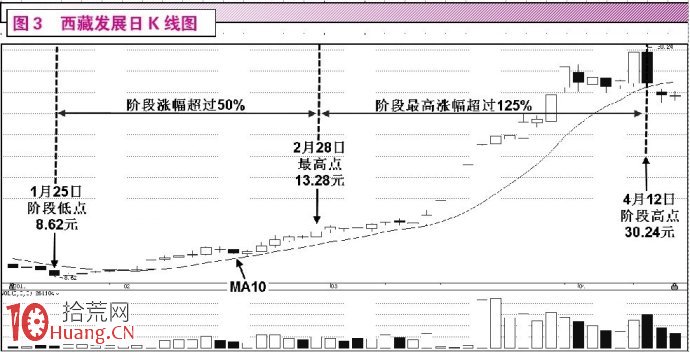 再如西藏发展走势如图3所示,该股1月25日创出阶段低点后,1个多月的时间内从8.62元上涨至13.28元,涨幅超过50%,上升角度始终保持在45°以下,上升趋势极为流畅,很少出现大幅震荡走势。24个交易日后股价创出30.24元的阶段高点,累计涨幅超过125%。我们需要做的就是按照操作策略买入,设好止损并一路持有。