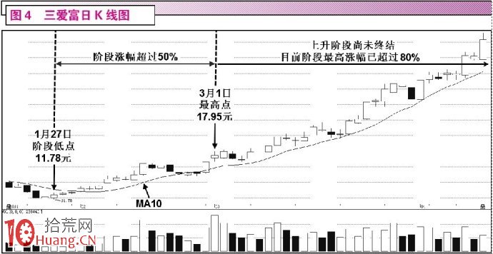 我们再来看看目前市场上符合此种模式的交易机会——三爱富(见图4)。该股1月27日创出11.78元的阶段低点,随后一路快速攀升,短短一个多月的时间就完成了50%的阶段涨幅。截止今日该股仍在加速上升阶段中运行,自完成阶段涨幅超过50%的3月1日最高价17.95元算起,累计涨幅已超过80%。