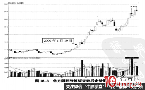 图18-2为此股2009年1月19日涨停板分时图,虽然当日此股是以尾盘一波封涨停板的方式来完成突破的,但是从图18-1中我们可以看到。此股当日并没有出现放量,这说市场中的筹码锁定良好、主力控盘能力强,是个股随后仍将突破上扬的信号。