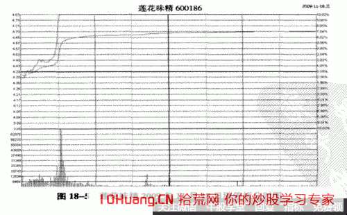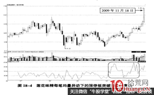 图18-4为莲花味精(600186) 2009年6月18日至11月18日期间走势图,此股在长期的盘整走势后,出现了每笔均量大幅攀升的形态,由于此股当时的盘整区所在位置从中长线来看仍属低位区,因此我们可以认为这是主力建仓或加仓的标志。随后,此股出现了涨停板突破的形态,这说明主力在此之前确有较大力度的加仓操作,而短笔均量正是提前反映了主力的这种操盘行为。